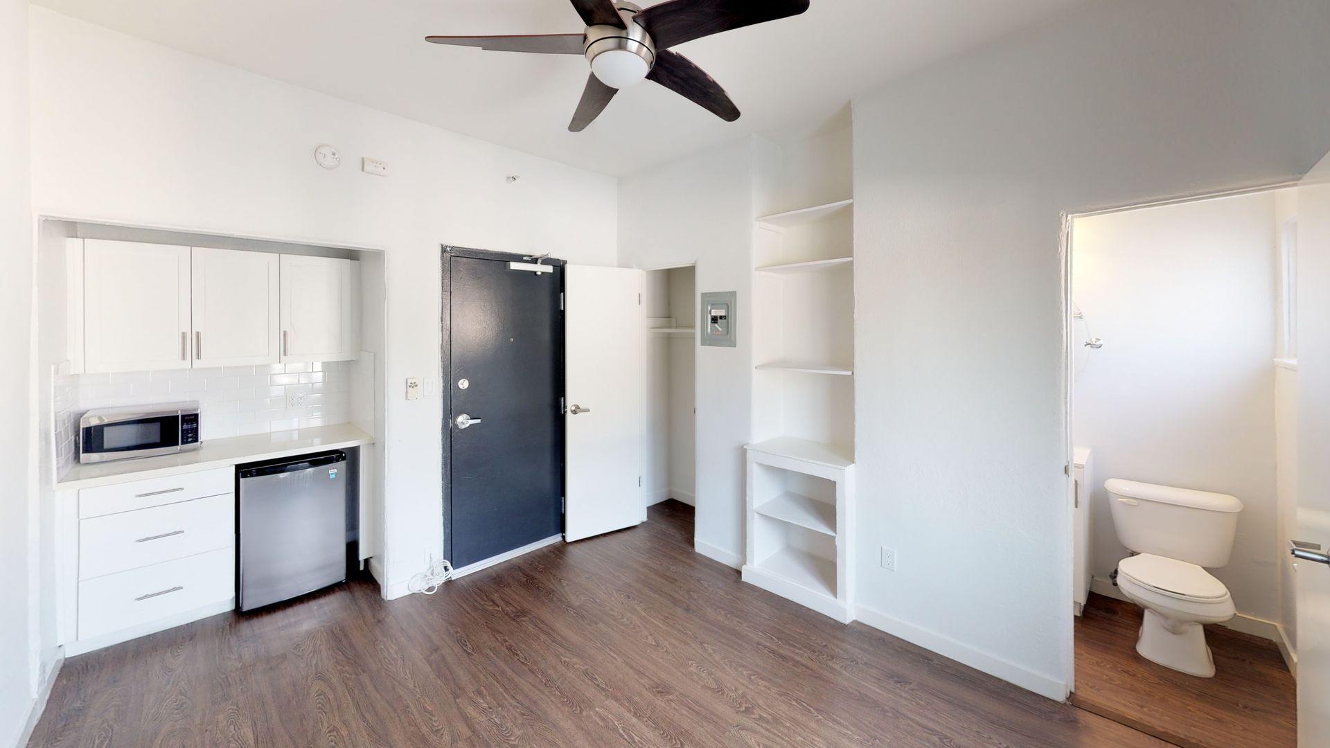 The bachelors are approximately 160 sq ft. Also ask about our Studios and 1 Bedroom units! Pets will be subject to a $25/month, per pet fee, with a maximum of 2 pets per unit. For those approved applicants with ESAs or service animals related to an accommodation due to disability, no pet rent will be charged.